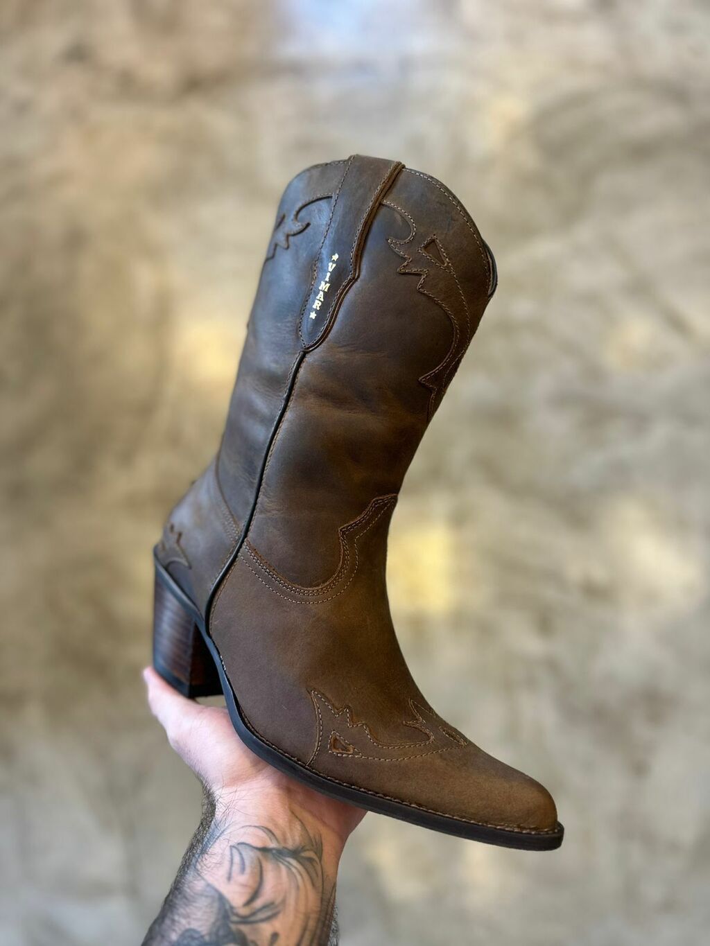 Bota feita em 100% Couro Legítimo, Solado Madeira, Palmilha, Costurada e Colada.