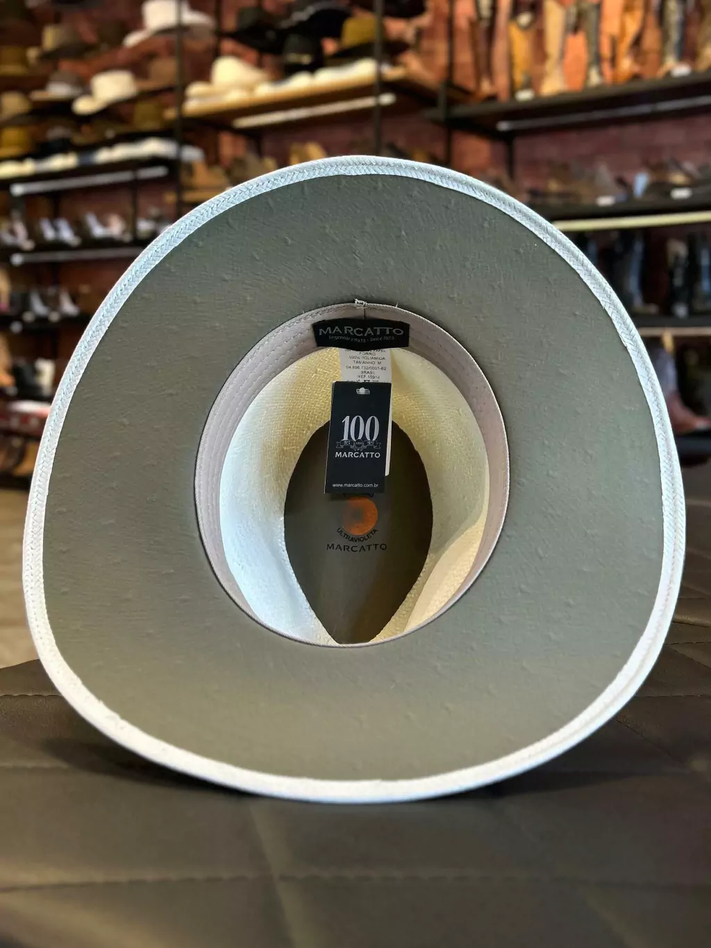 Chapéu Marcatto modelho palha feito em fibra de celulose, com bandinha em material sintético, boton da marca Marcatto.