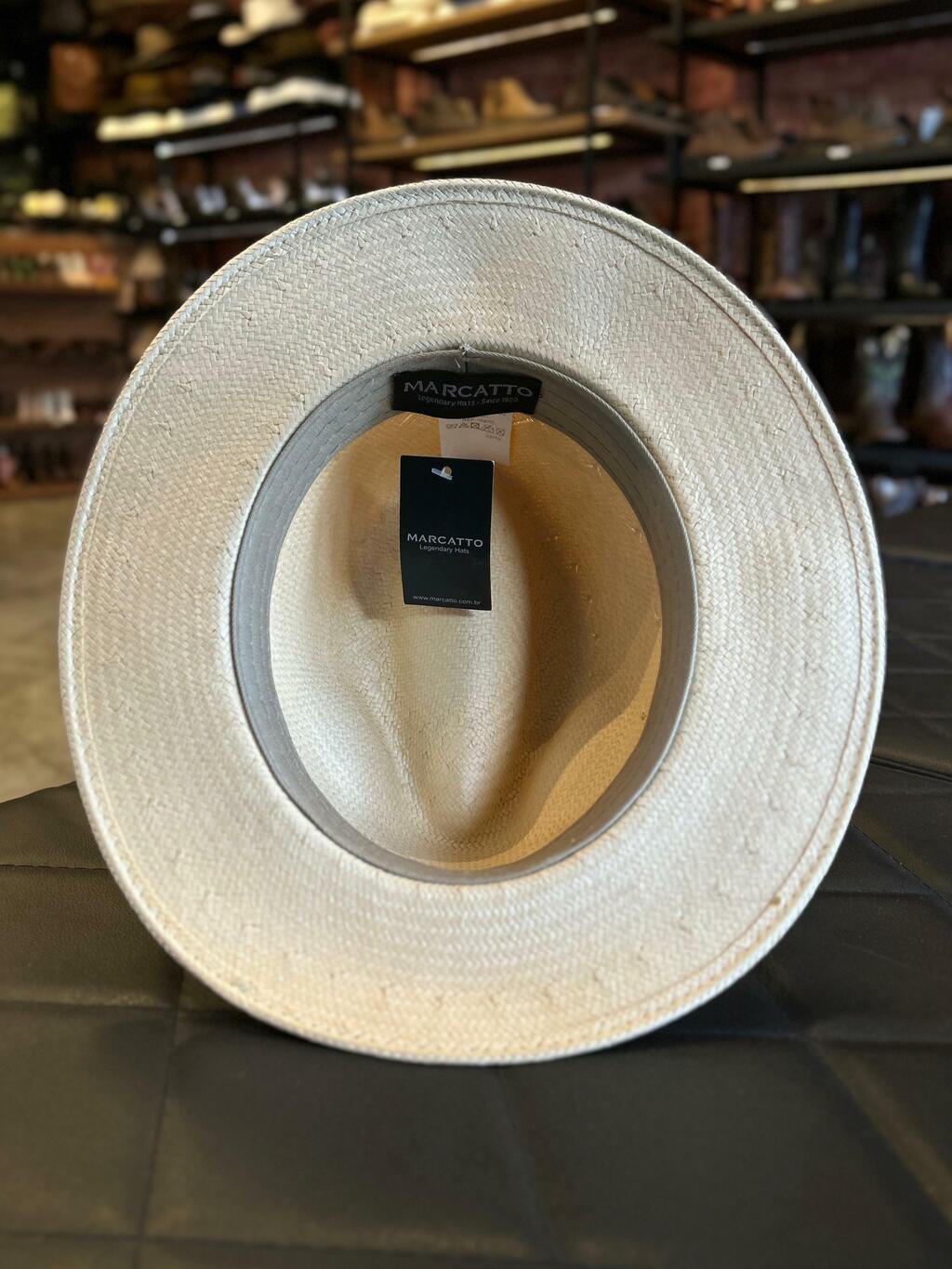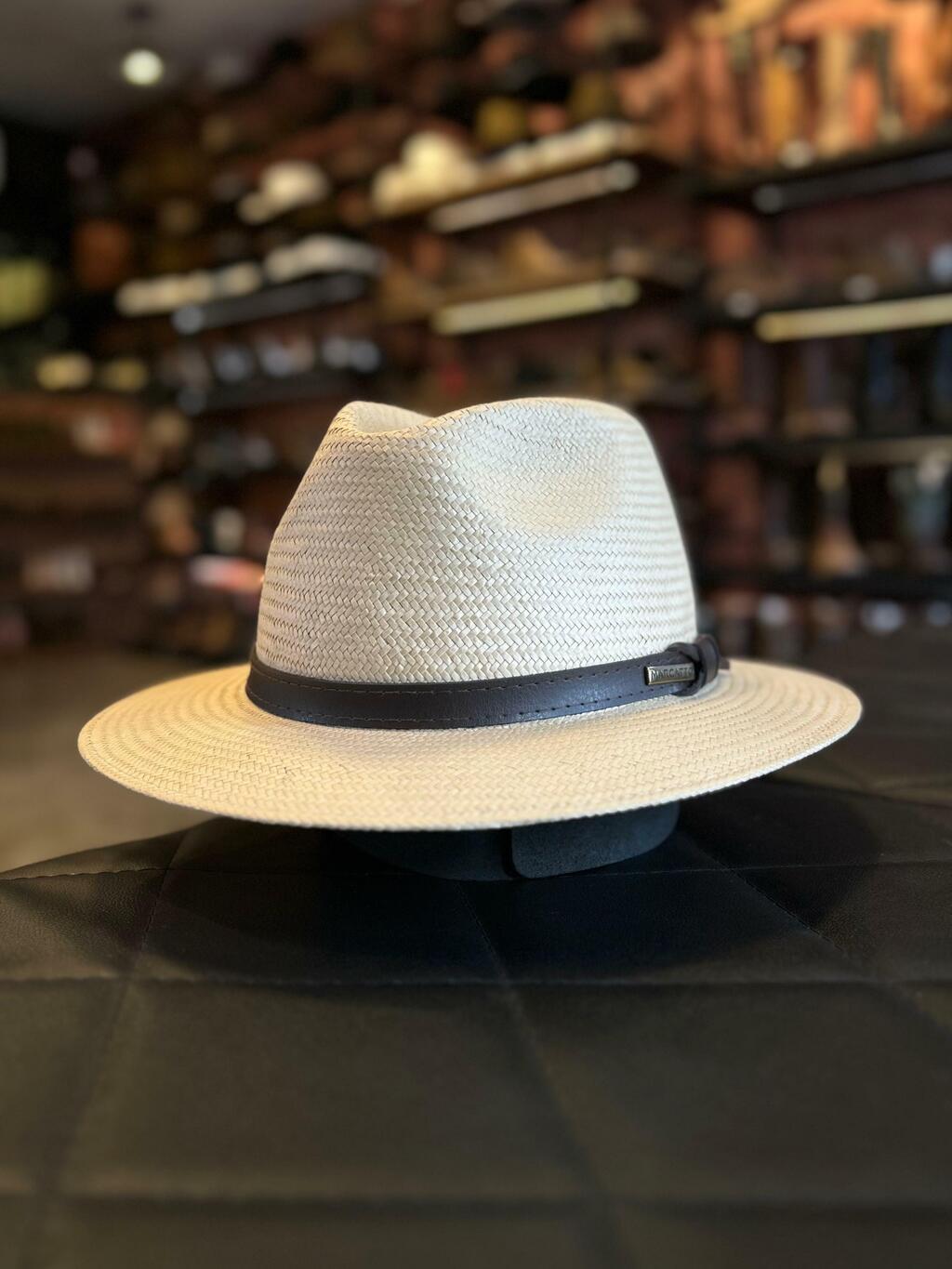 Chapéu Marcatto modelo palha feito em fibra de celulose, com bandinha em couro e boton da marca.