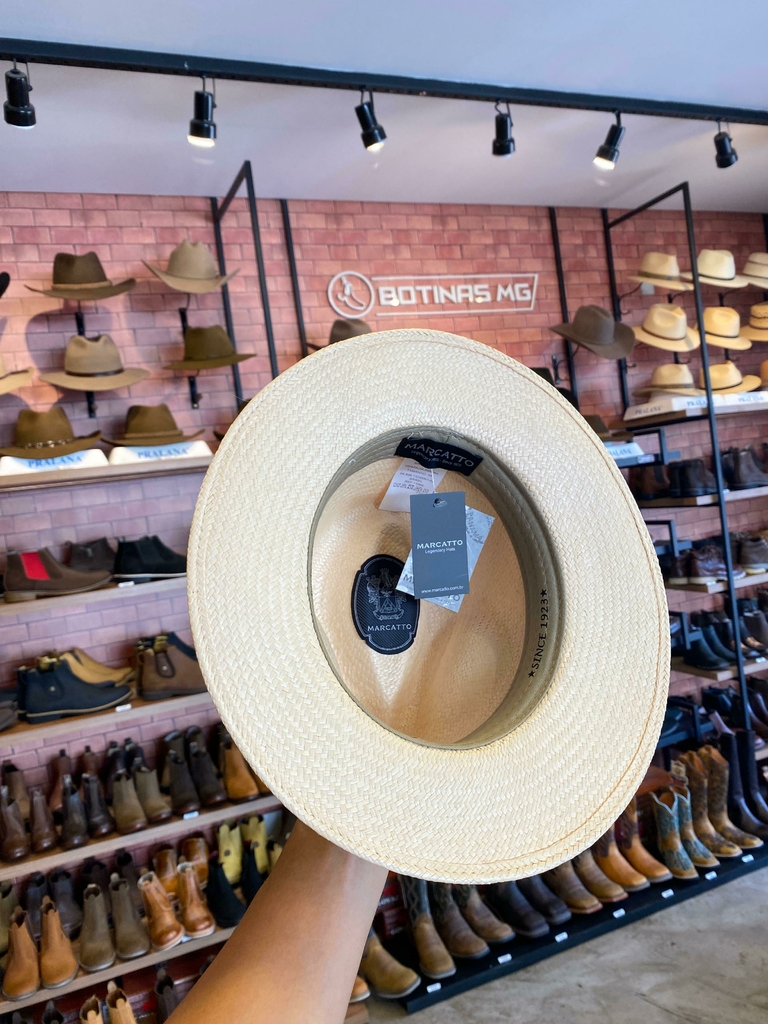 Chapéu Marcatto modelo palha feito em fibra de celulose, com bandinha em material sintético, boton da marca Marcatto.